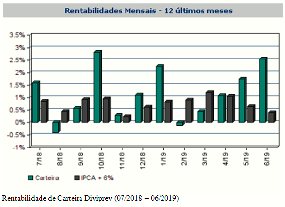 Para o ano de 2019, a meta atuarial está estipulada em 5,14%. O Diviprev já está 3,05 pontos percentuais acima, apresentando rentabilidade de 8,19%.