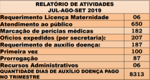 Também neste mesmo período foram marcadas 187 perícias médicas, sendo 92 e 59 nas Secretarias Municipais de Educação e Saúde, respectivamente, e 36 nas demais secretarias. Além disso, nos meses de julho, agosto e setembro, o Diviprev teve 67 requerimentos de contagem de tempo, e 52 análises de pastas funcionais para aposentadoria.